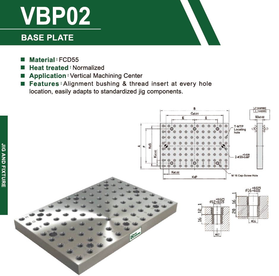 1.Material:FCD550 2.Heat treated:Normalized 3.Application:Vertical Machining Center 4.Features:Alignment bushing&thread insert at every hole lication ,easily adapts to standardized jig components