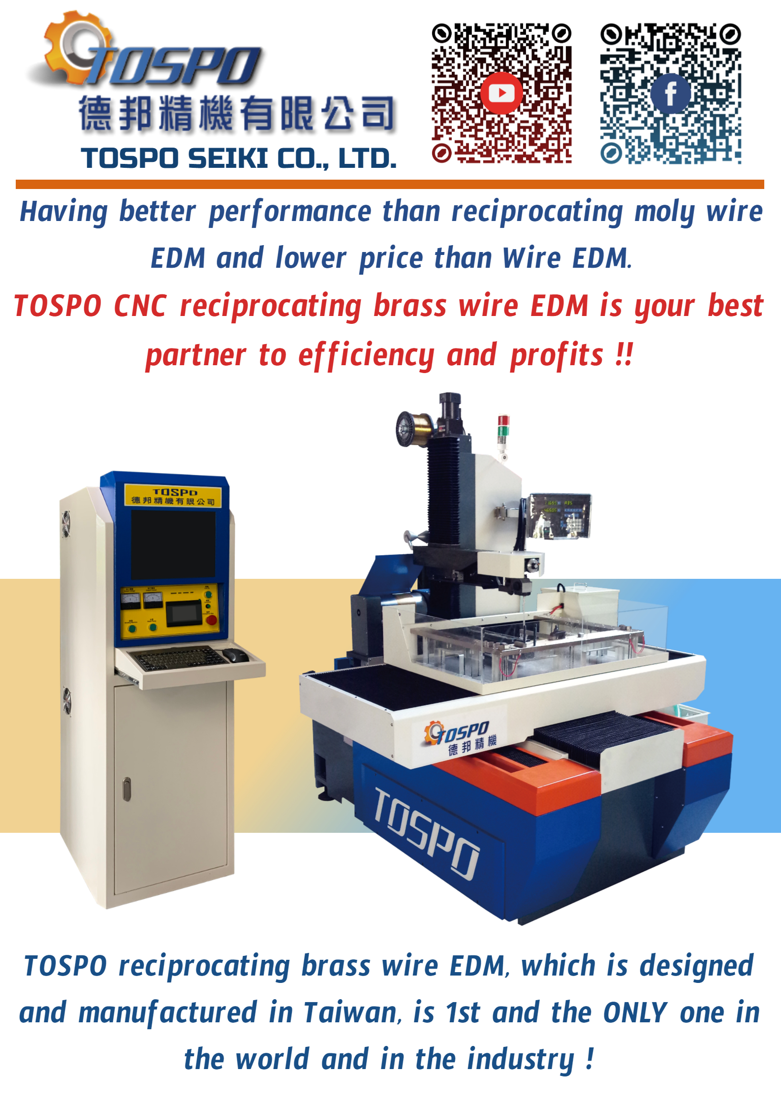 多方努力嘗試後,業界第一部擁有特殊銅絲加工技術的中快走絲線切割機問世了。