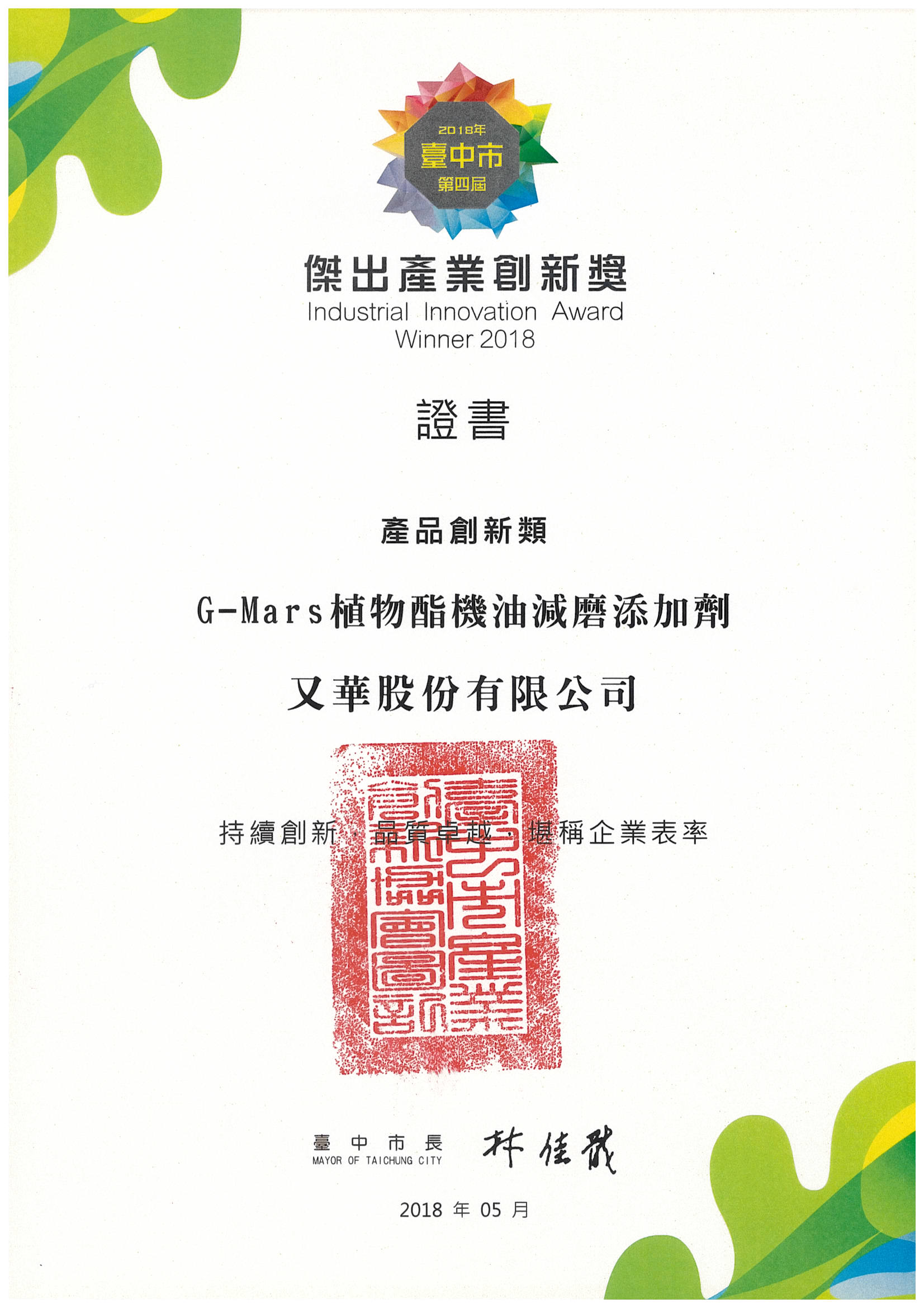 又華股份有限公司秉持「永續經營」與「愛護地球」的經營理念,開發出多項替代石化的綠能環保油品,從規劃製程打造油品生產設備,到選定植物油原料,由專業開發團隊把關,嚴守生產標準且技術領先同業,專營各式環保型可塑劑、添加劑、加工油及潤滑油品,以多元產品滿足各類加工需求用油。榮獲"創新產品"及"創新產業"獎項,深受各大廠牌的信賴與肯定,成為在企業因應環保趨勢時,改革突破的好夥伴。