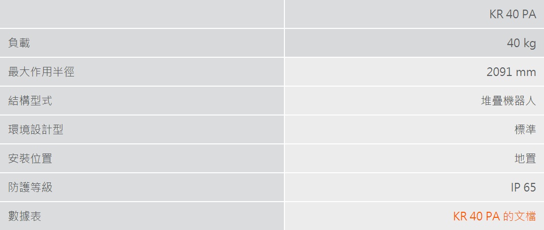 KR 40 PA 是庫卡公司最小巧、最輕盈的貨盤堆垛機器人。這款專為貨盤碼垛設計的工業機器人將幫助您獲得最快的速度和最高的精確性 – 歐標託盤碼垛的完美選擇。